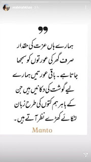 اپنے انسٹاگرام اسٹوری میں جاتے ہوئے ، ‘ورنا’ اداکارہ نے معاشرے میں خواتین کی موجودہ حیثیت کو بیان کرنے کے لئے ممتاز مصنف سعادت حسن منٹو کا ایک حصہ شیئر کیا۔